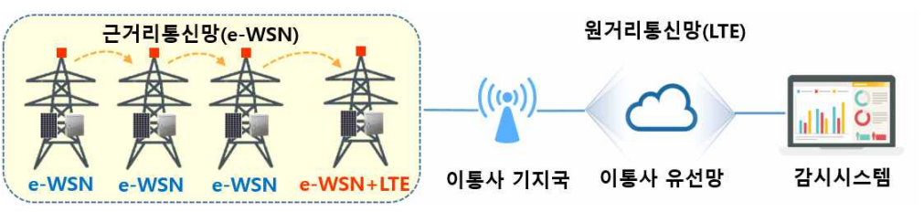 본 시스템은 항공장애등 상태정보 수집 및 전송을 목적으로 940㎒대역 비면허대역을 이용하는 e-WSN 무선통신기술을 활용하며, 취득한 센서 데이터를 e-IoT 표준프로토콜을 통해 상위 플랫폼으로 전송하기 위하여 LTE 통신망을 활용합니다.